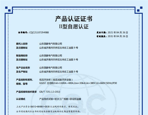 證書名稱:低壓開關(guān)柜(低壓成套開關(guān)設(shè)備)認(rèn)證證書